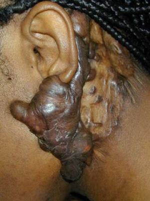 Outra complicação é a formação de queilóides, que são cicatrizes hipertrofiadas, que podem ocorrer após processos inflamatórios exuberantes. O quelóide pode ser deformante, como na foto acima. Este quelóide pode ocorrer em qualquer sítio do corpo onde haja uma reação ao piercing.