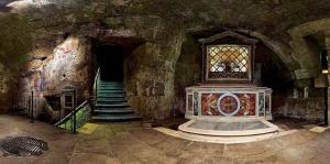 Entre esses está a impressão miraculosa da testa do Vigário de Cristo numa parede. O cárcere foi cavado numa camada de pedra vulcânica conhecida como ‘tufo’.