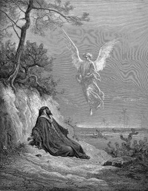 Deitou-se por terra, e adormeceu debaixo do junípero. Mas eis que um anjo tocou-o, e disse: Levanta-te e come.