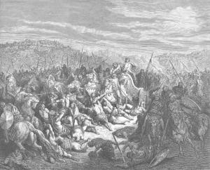 Durante sete dias ficaram acampados um em face do outro. No sétimo dia deu-se a batalha; os israelitas mataram num só dia cem mil sírios.
